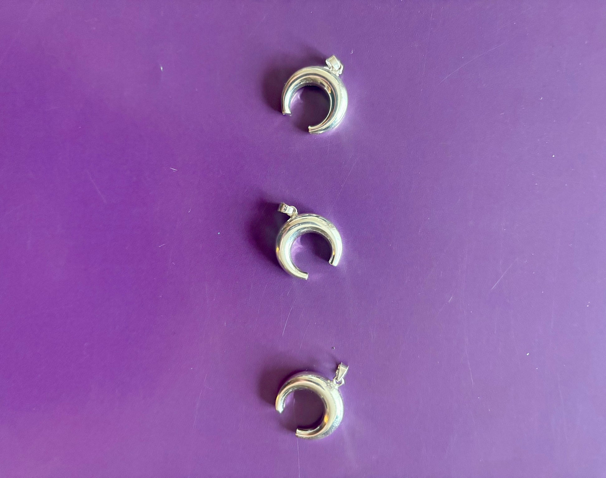 Der 17x19 mm große, beidseitig ausgewölbte Anhänger Mondsichel aus 925/- Sterlingsilber, gearbeitet in hochwertiger Juwelierqualität, hat eine sichelförmige, gekrümmte Form mit zwei gleichmäßig nach unten zeigenden stumpfen Spitzen, die so weit zusammengehen, dass sie in ihrer Mitte mit ein wenig Vorstellungskraft Geborgenheit und Festhalten symbolisieren. Der Anhänger ist innen hohl und an der Schlaufe oben 6mm breit. Ein wunderschönes spirituelles Geschenk.
