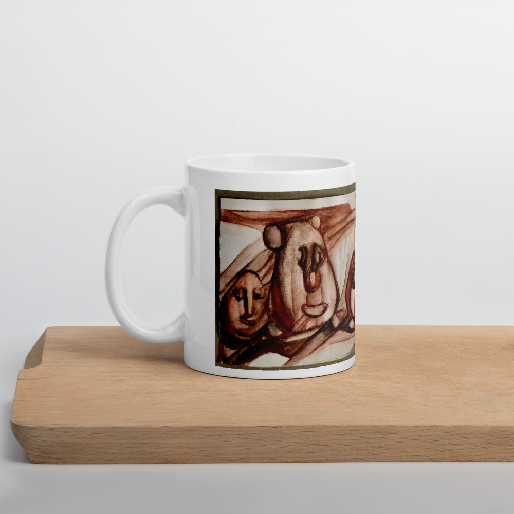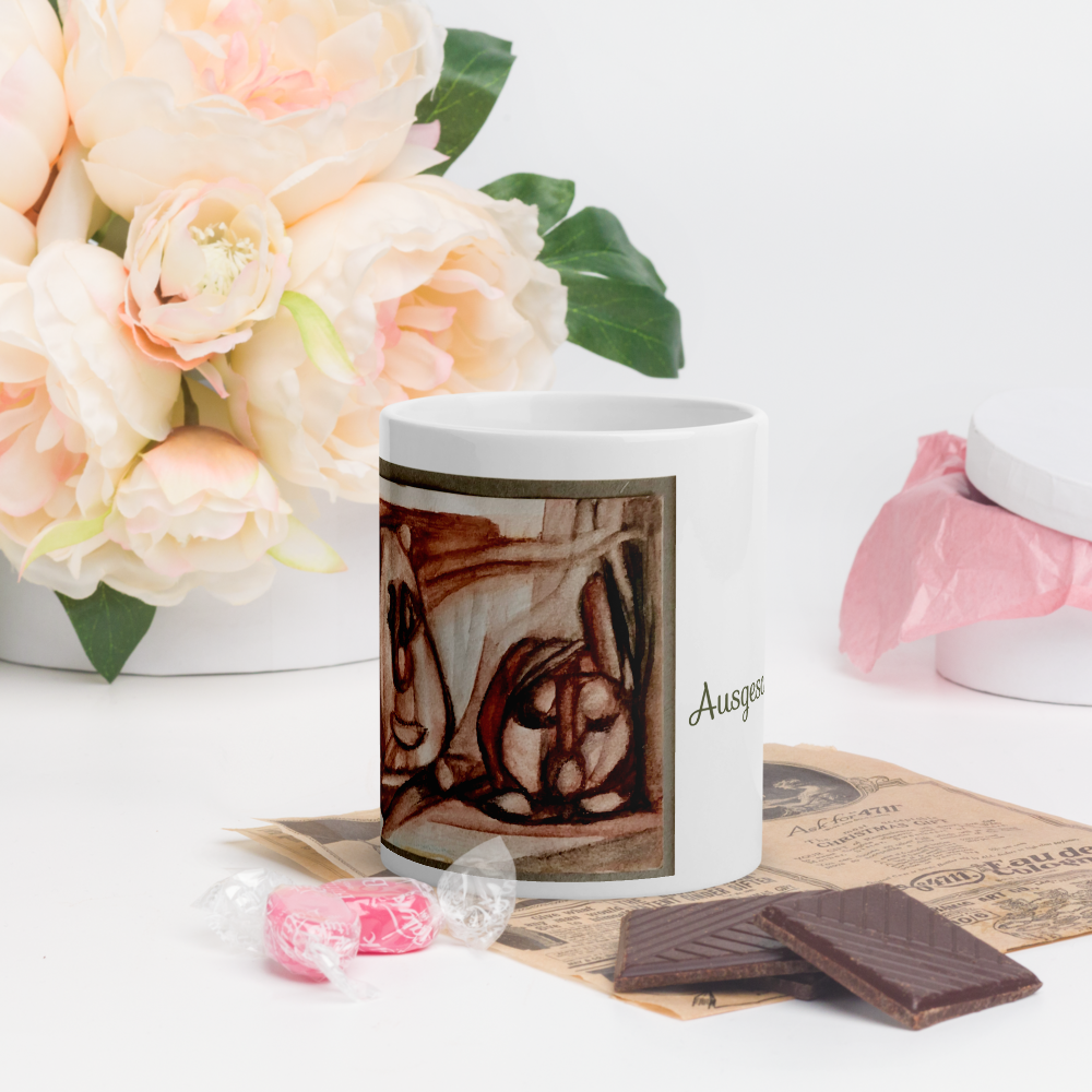 Keramikbecher mit Künstlermotiv und Aufschrift „Ausgeschlafen?"